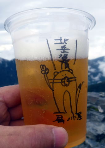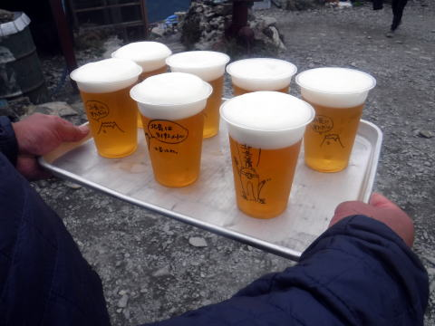 ((※肩ノ小屋に戻って、まずは生ビールで乾杯、お疲れさま。))