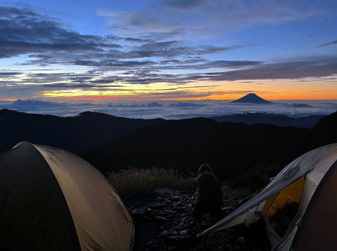 そして、テントに戻り、もうすでにとても眠いけどなんとかテント泊らしいことをしたいとワードウルフを楽しんだ 夜中は雨風吹き荒れたが、朝起きると、 朝日に照らされた富士山が厳かな雰囲気を醸し出しながらそこにいた じーんとなった 朝ごはんを食べ、名残惜し見ながらもさよなら北岳… みなさんと和気藹々楽しくおしゃべりしながらの下山。
