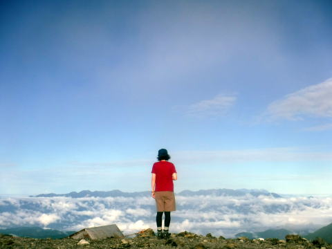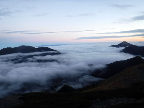 ((※左に仙丈岳、雲海を挟んで、右の三角が甲斐駒ヶ岳、ずっと向こうに北アルプスが見えています。))