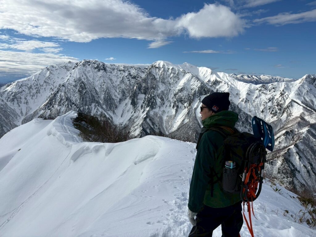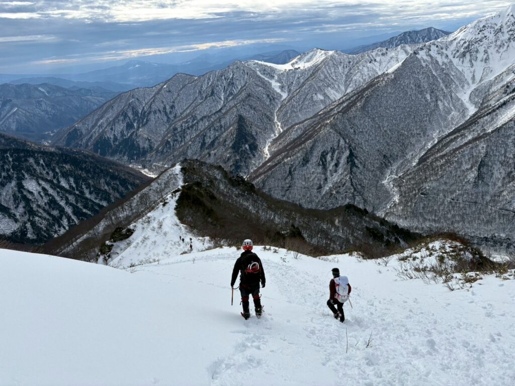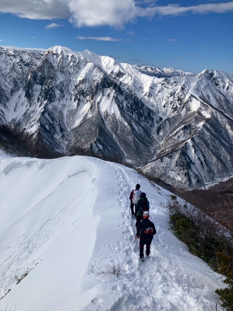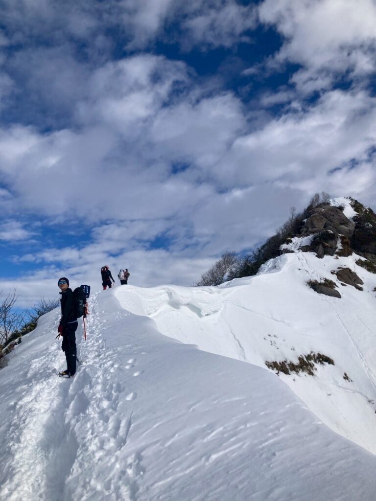 まだ雪は少なかったですが、よくしまって歩きやすく、山頂までツボ足で行けました。風もなく穏やかで春山のようでした。歩きながらどんどん上着を脱いで、水もたくさん飲みました。 急登の途中で振り返ると、谷川岳の雪に朝日が反射して輝いていました。山頂に着いても風がなくのんびりしました。下山はアイゼンを着けて少し雪の緩んだ急斜面を降りました。踏み抜くところもありました。 行きも帰りもこれから行きたい山の話でもちきりでした。今シーズン、たくさん雪山を楽しめますように! カテゴリー: 2025年