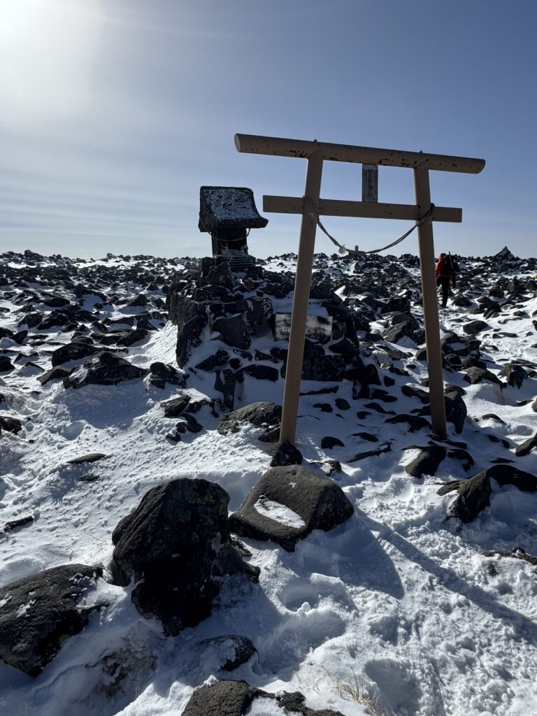 それでも頑張って到着した山頂は見晴らしも良く、隣の北横岳もはっきり見えていました。流石に山頂は寒かったです。