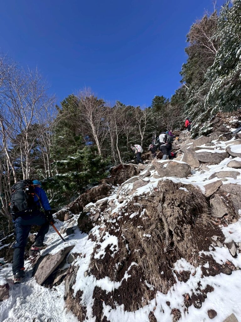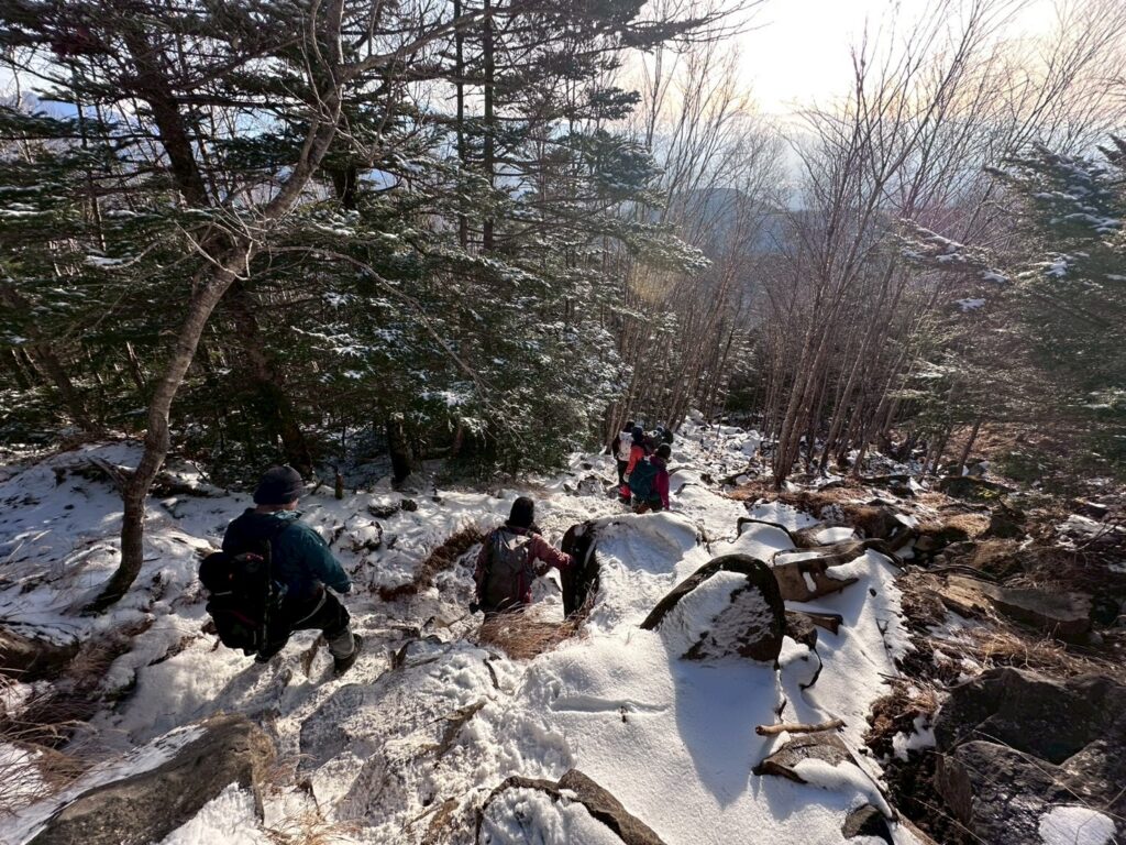 歩き出すとまだまだ雪が少なかったので岩が出ていて歩きづらいとこが多く、よじ登る場所もありました。