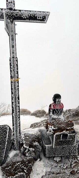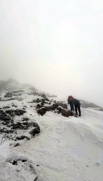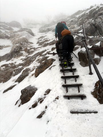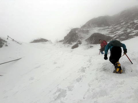 2日目、天気予報通りの霧で、空はどよ~ん。何も見えません!上空で風が吹いている音も、、、それでも、地蔵の頭までは行ってみよう!ってことで行ってみましたが予想通りの強風でお地蔵さまは猫神様のようなお顔で佇んていらっしゃいました。お地蔵さまにもお逢いできましたので、そこから始まる稜線は諦め、下山。ルートはしっかり出来ていて、ところどころ梯子も鎖も出てましたが半分以上は直登でしたので登りも下りもあっという間、エイミーさんは物足りなそうでした(笑)