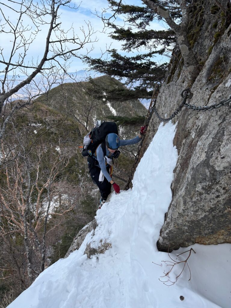 久しぶりのテント泊装備が重い。刃渡りの手前でチェーンスパイクを装着。