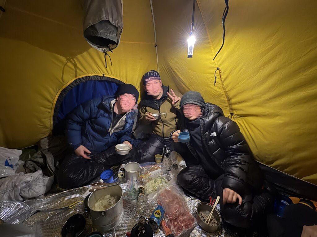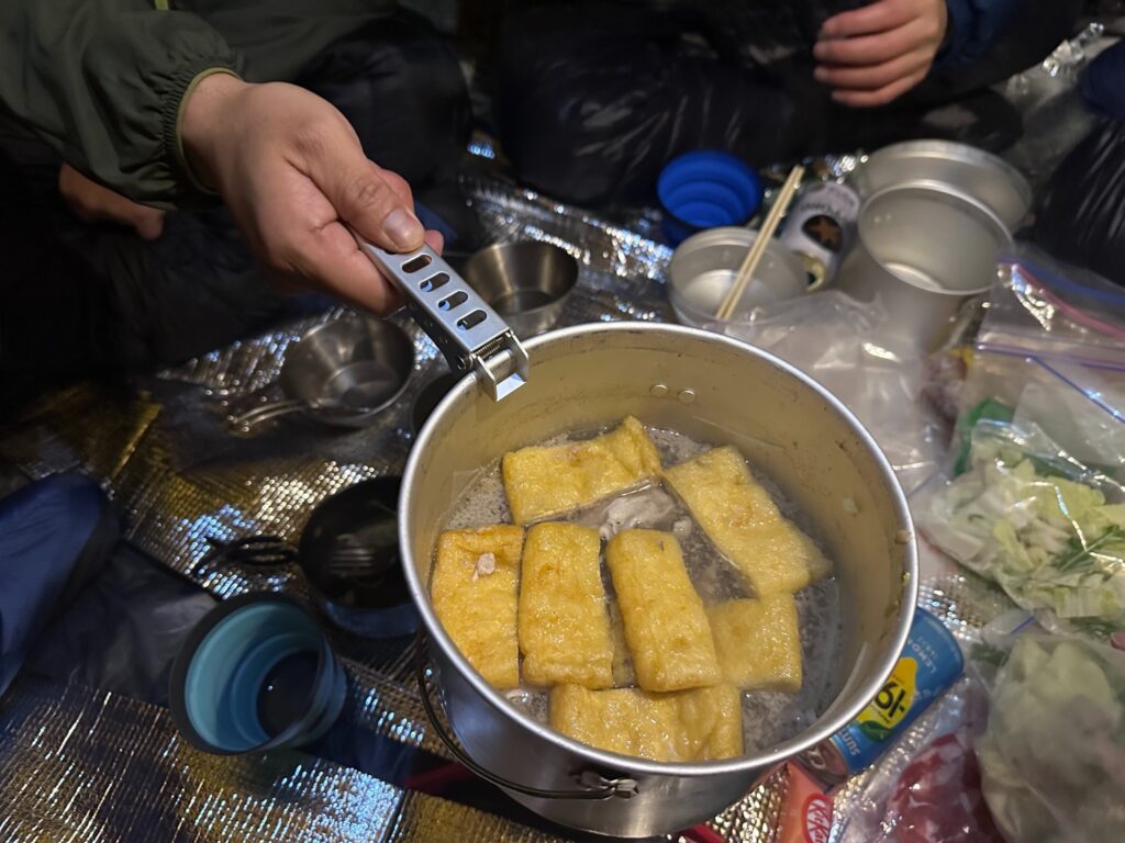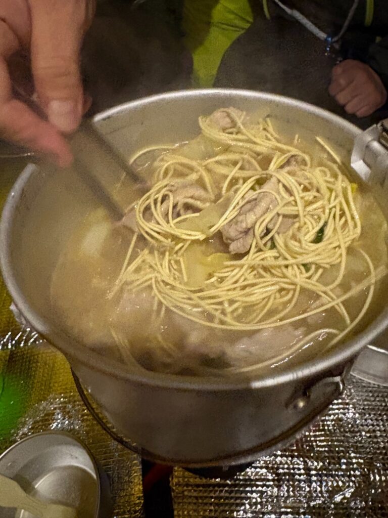 夜は山とは思えない豪華な夕食。お肉たっぷりの鍋に麺、さらに味変も楽しみながらしっかり食べました。