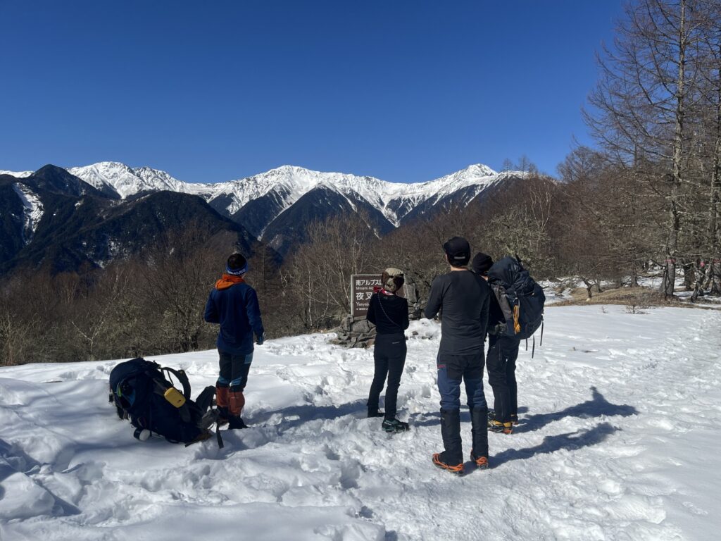初日は夜叉神駐車場を9時半頃に出発。空は雲がほとんどない快晴で、雪をまとった南アルプスの主峰・北岳がくっきりと見えます。気温もちょうどよく、条件は申し分ありません。