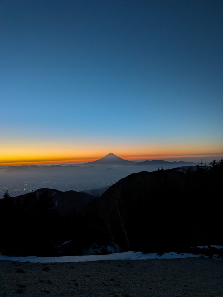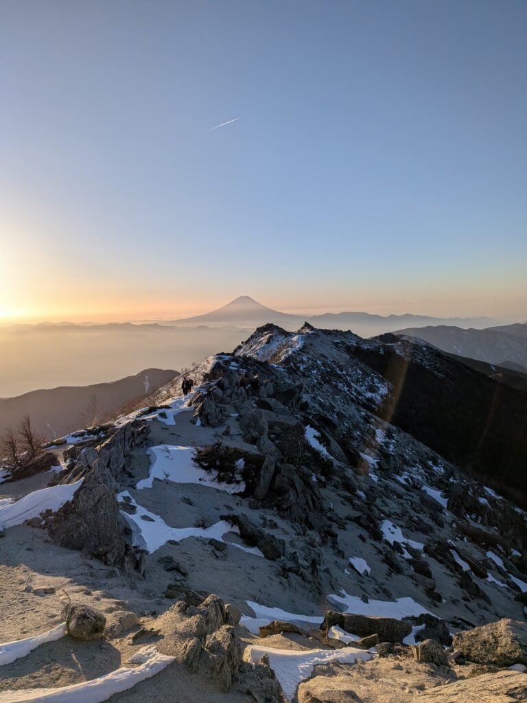 途中の尾根の景色は最高で富士山や白峰三山が白く聳え立つ。